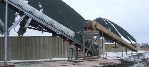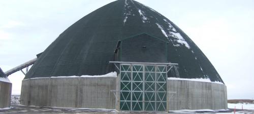 This project is located in Edmonton, Alberta, Fort Saskatchewan. The project consist of a wood dome and a conveying system. The wood dome is 150ft in diameter on a 16ft concrete wall foundation. The size and height of this wood dome gives a large volume for storing material. The conveying system is a 30" conveyor with a tower and hopper for loading. The conveyor provides loading from the ground travelling up to the top of the wood dome filling the wood dome from the center which takes full advantage of the size and space of the wood dome